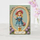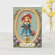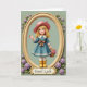Designed with a doll-like young girl centered inside an ornate pale-gold oval frame, this St. Patrick’s Day card sets a gentle, friendly mood with a soft smile and bright blue eyes that seem to meet yours. Her blonde curls and rosy cheeks pair with a teal-blue dress featuring a white Peter Pan collar and cuffs trimmed with lace, and a small brown bow at her waist. A wide pink hat topped with tiny red blossoms tilts above her face, while white tights and sunny yellow boots add a surprising pop of color 💚. In her right hand she holds a woven basket overflowing with pink flowers, and her raised left hand looks like a quiet hello to someone she cares about ☘️. Purple blossoms and green leaves curl around the frame’s edges, like they’re growing toward her in a sweet, welcoming way. The background stays a muted sage green so the figure and flowers stand out without feeling loud. The words “Good Luck” appear in darker lettering on a decorative plaque centered below the frame, surrounded by curled flourishes and small leaf details. Share St. Patrick’s Day sentiments with someone special, and let them notice the pale-gold plaque tucked neatly beneath the oval frame.