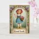 This card shows a sweet young girl standing in a sculpted archway, her blonde curls peeking out beneath a wide-brimmed pink hat as she looks forward with a gentle, friendly gaze 💚. She wears a sky-blue dress with a lace collar and a small brown bow, and her mustard-yellow boots add a sunny touch near the bottom of the scene. Tucked in her arm is a woven basket brimming with pink hydrangeas, like a thoughtful gift from a close friend. Around the arch, purple blossoms and winding green vines curl and climb, framing her like a garden doorway ☘️. The background sits in soft blue-green tones with warm, diffused light that makes her rosy cheeks and bright blue eyes stand out. Near the base, a simple pedestal carries the words “Good Luck” in dark lettering centered on the front. One of her hands is lifted slightly as if mid-wave, inviting you closer while the flowers spill over the basket’s rim in rounded pink clusters.
