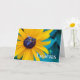 Gracias, Merci en espagnol. Carte de voeux papier avec photo florale d'une Susan aux yeux noirs et d'une abeille au miel sur le devant de la carte. Couleurs jaune, brun foncé et bleu-vert utilisées dans cette photo macro sur le thème de la nature. Copyright © Shoaff Ballanger Studios, 2022.