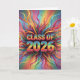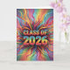 This image is a dazzling explosion of color and celebratory energy, perfect for a "Class of 2026" graduation. The central text, "CLASS OF 2026," is rendered in a bold, three-dimensional, rainbow-striped font that pops against the background. Surrounding the text is a vibrant burst of swirling, ribbon-like streamers and confetti in every color of the rainbow, creating a dynamic and festive atmosphere. Small stars and whimsical shapes are scattered throughout, adding to the joyous and energetic feel. The overall impression is one of excitement, achievement, and a colorful start to a new chapter.