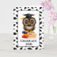 Graduation card is shown with a wise owl on books print. Message inside. Customize this card or buy as is. Licensed