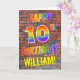 La façade de cette carte de voeux captivante, vibrante et passionnante sur le thème de l'anniversaire comprend le message "HAPPY 10TH BIRTHDAY" avec des lettres ayant un arc-en-ciel multicolore comme un motif dégradé, et un nom personnalisable couleur jaune, sur un arrière - plan motif mur en brique. L'aspect s'inspire de celui des graffitis ou de l'art de rue dessinés sur les murs. L'intérieur comporte un message d'anniversaire qui peut être customisé. Une carte de voeux d'anniversaire amusante, heureuse et personnalisable comme celle-ci pourrait être utilisée pour envoyer un message de voeux d'anniversaire à quelqu'un célébrant son dixième anniversaire. [~Z0000357]