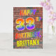 L'avant de cette carte de voeux vibrante, excitante et amusante à thème d'anniversaire comprend le message "HAPPY 33RD BIRTHDAY" avec des lettres ayant un arc-en-ciel multicolore comme un motif dégradé, et un nom modifiable jaune, sur un arrière - plan motif mur de briques. Le style s'inspire de celui des graffitis ou de l'art de rue dessinés sur un mur. L'intérieur est doté d'un message d'anniversaire personnalisé. Une carte de voeux d’anniversaire amusante, heureuse et personnalisée comme celle-ci pourrait être donnée pour célébrer le trente-troisième anniversaire de quelqu’un. [~Z0000357]