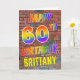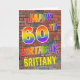 L'avant de cette carte de voeux amusante, attrayante et vibrante sur le thème de l'anniversaire comprend le message "HAPPY 60TH BIRTHDAY" avec des lettres ayant un arc-en-ciel multicolore comme un motif dégradé, et un nom personnalisé jaune, sur un arrière - plan motif mur de briques. Le style s'inspire de celui des graffitis ou de l'art de rue dessinés sur un mur. L'intérieur comporte un message d'anniversaire qui peut être customisé. Une carte de voeux d'anniversaire joyeuse, amusante et personnalisable comme celle-ci pourrait être donnée à quelqu'un qui célèbre son soixantième anniversaire. [~Z0000357]