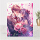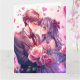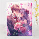 Couple de garçon et fille anime mignons de grande taille s'étreignant entouré de notes de musique et de cœurs en violet et rose. Carte de la Saint-Valentin personnalisée mignonne pour le couple qui aime l'anime ! Ajoutez votre photo et changez votre texte dans la zone de personnalisation.