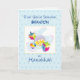 Envoyez cette carte délicieuse à votre petit-fils à Hanoukka. L'arrière - plan bleu clair a des points bleus plus foncés. Un rêve avec jouets et cadeaux est au centre de cette carte de vacances juive. Personnalisez la carte avec son nom sur le devant.