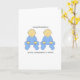 Des garçons jumeaux dans des tenues bleues assorties et les mots "Félicitations, vous êtes grands-parents à jumeaux".