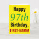 Ce design de carte orienté de salutation d'anniversaire audacieux et fortement évident a le message le "joyeux quatre-vingt-dix-septième anniversaire," sur l'avant. Les caractéristiques intérieures un message customisé de salutation d'anniversaire, ou pourraient peut-être être dégagées et sont parties du blanc si un message doit être écrit à la main à la place. Une plus grande copie est employée pour essayer de faciliter la carte pour voir et lire. Une carte d'anniversaire personnalisable comme ceci pourrait être une manière d'amusement d'envoyer des souhaits d'anniversaire à quelqu'un qui célèbre leur quatre-vingt-dix anniversaires de septième. [~Z0000390]