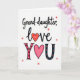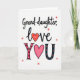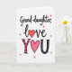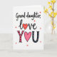 This greeting card features the message “Grand-daughter, I love YOU” centered on a white background. “Grand-daughter” sits at the top in black cursive-style lettering that looks like it was written by hand. Under it, “I love YOU” takes up most of the space, with “love” in deep teal and dotted with small red spots. The “o” in “love” is a bright red heart with light pink dots and a small white chevron detail inside it. “YOU” is large and eye-catching: the Y has red and pink stripes, the O is a pink heart outlined in black, and the U matches the teal dotted look from “love.” Small red crosses and tiny starburst shapes are scattered around like confetti, which makes it feel extra happy and caring 🥰❤️. It’s a simple, loving way to say what you feel, and it’s easy to share your Valentine’s Day sentiments.