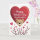 This greeting card shows a large red heart near the top, shaded to look softly rounded. Across the heart, the text reads “Happy Valentine’s Day Granddaughter” in white, flowing cursive-style lettering. A cute teddy bear peeks out from behind the heart, showing its head and paws with round ears, wide dark eyes, and a small black nose. The bear’s sweet expression makes the card feel gentle and caring, like a hug in picture form 🥰. The background is white, with smaller pink hearts floating upward beneath the main heart. There are also thin branches with tiny pink buds mixed in, adding a soft, springlike touch. It feels meaningful because it pairs a simple love message with an affectionate character that suits a granddaughter ❤️. Wishing you a happy time sharing Valentine’s Day sentiments.