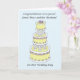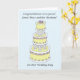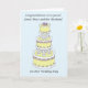 Un gâteau à plusieurs étages, design, citron et blanc mariage, posé contre un arrière - plan bleu pastel. Les mots "Félicitations à la grande nièce spéciale et à son mari le jour de leur mariage", accompagnent l'image.