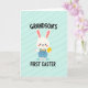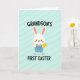 Designed with a sweet, simple illustration, this Easter card centers on a white, long-eared bunny standing front and center with a gentle, friendly look 🐰. The bunny wears soft blue overalls with a tiny pocket and a small yellow bow tie, adding a dressed-up touch that feels like it’s ready for a special day. Rosy pink cheeks and warm, easy eyes give the face a tender, affectionate expression, like it’s sharing a quiet moment with someone close. In one paw, it holds a shiny golden oval egg, angled slightly upward as if offering it as a small gift. The background is pale aqua with faint diagonal brush-like strokes that add texture without distracting from the character. Across the top, “GRANDSON’S” appears in uppercase lettering, and “FIRST EASTER” sits at the bottom in matching uppercase type, both in a dark tone that stands out clearly. A soft pastel palette of blues, pinks, white, and yellow keeps the scene light and springlike 🌷, with the bunny’s golden egg catching the eye against the cool aqua backdrop. The pale aqua background shows subtle diagonal strokes behind the centered bunny, with the top and bottom text framing the figure.