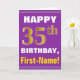 Ce simple design de carte de voeux sur le thème de l'anniversaire présente un voeu d'anniversaire chaleureux comme "HEUREUX 35ème anniversaire, prénom!" sur le devant, en texte gras sur un arrière - plan de couleur violette. Le numéro d'anniversaire a un look de couleur imitation or. Le nom sur le devant peut être personnalisé. L'intérieur comporte un message d'anniversaire qui peut être customisé. Une carte de voeux comme celle-ci pourrait être une façon amusante d'offrir des voeux d'anniversaire à quelqu'un qui célèbre son trente-cinquième anniversaire. [~Z0000277]