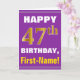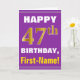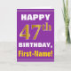Ce simple design de carte de voeux sur le thème de l'anniversaire présente un voeu d'anniversaire chaleureux comme "HAPPY 47th BIRTHDAY, First-Name!" sur le devant, en texte gras sur un arrière - plan de couleur violette. Le numéro d'anniversaire a une apparence de coloration fausse/imitation or. Le nom sur le devant peut être personnalisé. L'intérieur comporte un message d'anniversaire personnalisable. Une carte de voeux comme celle-ci pourrait être une façon amusante d'offrir des voeux d'anniversaire à quelqu'un qui célèbre son quarante-septième anniversaire. [~Z0000277]