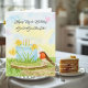 This spring-themed birthday card features a daffodil-inspired birthday cake, the flower of March, with a robin perched on a wooden cake stand, creating a cheerful and meaningful design for a great granddaughter’s birthday.