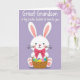This card features a stylized white rabbit sitting front and center on a pastel lavender background 🐰. Its long ears have soft pink inner details, and its round face shows small black eyes, rosy cheeks, fine whiskers, and a bright pink nose that feels sweet and welcoming. A deep pink bow at the neck adds a dressed-up touch, like it’s ready to celebrate with someone special. The rabbit holds a woven basket close between its paws, creating a cozy, caring moment as if it’s offering a gift with quiet affection 🌷. Inside the basket, patterned eggs fill the space with stripes and swirls in yellow, blue, green, and pink, bringing a springtime look without feeling crowded. At the top, white text is placed above the rabbit in two lines, reading “Great Grandson,” followed by “A big Easter basket of love to you.” The basket’s textured weave and the eggs’ tiny patterns stand out crisply against the smooth lavender backdrop.