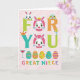 This design shows a festive scene on a soft, textured pale pink background, centered around the message “FOR YOU GREAT NIECE” in thick, outlined letters filled with different bright colors. The words sit in the middle of the card, with the text stacked and spaced so it feels like a cheerful banner. Cute rabbit faces 🐰🐇 peek from inside and on top of a few letters, their rosy cheeks and wide eyes giving the group a tender, friendly look as if they’re leaning in close together. One bunny wears a tiny golden crown, adding a sweet little “guest of honor” touch to the lettering. Small rounded creatures in aqua and yellow perch on the letters too, like tiny companions sharing the spotlight. Beneath the message, five decorated oval egg shapes line up in a neat row, each patterned with dots, zigzags, or stripes in varied colors. To the left of the eggs sits a simple goblet-like icon with a red interior, and the eggs are edged with light outlines against the pink backdrop.