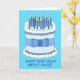 Un grand gâteau d'anniversaire en caricature bleue et blanche est dressé contre un arrière - plan de couleur bleue et les mots "Heureux Anniversaire grand oncle".