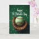 This greeting card shows a lime-green baseball with red stitching nestled snugly in a worn, honey-brown leather glove at the center, like a close embrace between old friends. Behind them, a deep emerald background is dotted with soft, out-of-focus light spots in lighter greens that read like clovers drifting through the air ☘️. The lighting falls gently across the glove’s creases and seams, giving the leather a cozy, lived-in look while the ball keeps a smooth, slightly glowing finish 💚. Near the top, the phrase “happy St. Patrick’s Day” appears in white, flowing lettering, spaced so it sits clearly above the glove and ball. The bright ball against the darker green backdrop creates a strong contrast, and the red stitches echo the warm tones in the glove. The scene feels like a shared celebration where the equipment seems to lean into each other, inviting a quiet moment between teammates or sweethearts. The background shifts subtly from darker green at the edges to a lighter green haze near the center, with scattered clover-like light circles surrounding the main image.
