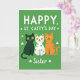 Designed with a rich emerald-green background, this St. Patrick’s Day card features three stylized cats lined up side by side, giving each other the kind of easy, friendly closeness that feels like a sisterly inside joke 💚. On the left is a sleek dark green cat with wide yellow eyes, followed by a white cat dotted with lime-green spots, and then an orange tabby with soft stripes, all wearing matching small smiles. Scattered across the green field are tiny white shamrock shapes that float like confetti ☘️. Across the top, the phrase “HAPPY ST. CATTY’S DAY” appears in large white lettering, centered and easy to read against the dark background. Beneath the cats, the word “Sister” is written in a flowing style in white, placed low and centered under the trio. The flat, vector-like look keeps the shapes simple and the colors solid, with no heavy shading. The cats’ round eyes, curved mouths, and the repeating shamrocks stand out crisply against the deep green backdrop.