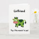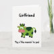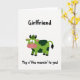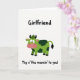 This card features a lime-green cartoon cow standing on a bright white background, with darker emerald patches that give it a festive St. Patrick’s Day look ☘️. Its wide white eyes and tiny black pupils face forward with a gentle, slightly bashful expression, like it’s greeting someone it cares about. A rosy pink snout with neat swirl rings adds a blush-like touch, while small black horns and a spiky darker-green tuft of hair bring a bit of cheeky confidence 💚. The cow’s slim dark-green tail ends in a black tuft that matches the black hooves, keeping the details tied together. At the top, the word “Girlfriend” appears in black, friendly sans-serif lettering, centered above the character. At the bottom, the phrase “Top o’ the moonin’ to you!” is also centered in the same black type, sitting beneath the cow like a caption. The simple layout leaves lots of white space around the figure, making the green body, pink snout, and black text stand out clearly. The cow’s emerald patches, black horns, and dark tail tuft are the strongest accents against the white field.