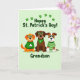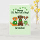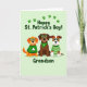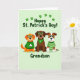 This card shows three friendly, human-like dogs lined up side by side on a pale celadon background, all facing forward as if posing together for a sweet St. Patrick’s Day photo 💚. Each one wears bright green-rimmed glasses, and their close spacing and gentle expressions suggest an easy bond, like pals who showed up dressed to match. The golden dog on the left has a green sweater with a small white shamrock on the chest, while the brown dog in the middle wears a green bandana with the same shamrock mark. On the right, the brown-and-white dog wears a green striped jumper that adds a little extra motion to the lineup, as if it just leaned in for the picture ☘️. Across the top, “Happy St. Patrick’s Day!” appears in deep emerald lettering, with small shamrocks scattered around the words like confetti. Near the bottom, “Grandson” sits centered in matching green text, balancing the layout and drawing the eye downward. The overall look stays simple and graphic, with smooth color areas and no heavy shadows. Tiny shamrock icons dot the space above the dogs, framing the headline against the soft green field.