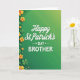 This greeting card features a green gradient background that shifts from bright lime in the upper right to deep emerald in the lower left, setting a festive St. Patrick’s Day scene 💚. Centered on the front, the main message reads “Happy St. Patrick’s Day” in flowing white lettering, with “BROTHER” placed just below in large uppercase letters for emphasis. Small, simple arrows sit near the word “DAY,” subtly pointing inward as if guiding your eyes back to the greeting. Along the left edge, a vertical border of stylized flowers and clover shapes forms a decorative garland that feels like a friendly nudge from someone who knows you well ☘️. The flowers are sunny yellow with rounded petals, and each clover-like green shape is marked with a small red dot at its center. Soft shadowing gives the border elements a slight layered look, adding depth against the smooth background. The overall layout keeps the text clear in the middle while the floral strip frames it from the side, with lime-to-emerald color fading diagonally behind everything.