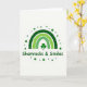 This greeting card features a white background with a green rainbow arcing across the center, made of three concentric bands that shift from deep emerald on the outside to bright lime toward the middle. Each band has gentle, swirling textures that give it a soft, inviting look, like something you’d linger over with a close friend. Above the arc, a scatter of small green dots forms a light halo, like confetti or dew catching the light, adding a flirty sparkle 💚. Centered under the rainbow sits a classic three-leaf shamrock in rich green, grounding the scene with a steady, lucky charm ☘️. Beneath the shamrock, the phrase “Shamrocks & Smiles” appears centered in rounded green lettering, easy to read and friendly in tone. The spacing keeps the artwork and text comfortably balanced, leaving plenty of white space that makes the greens stand out. The rainbow’s upper curve is ringed with dots in several shades of green, from darker forest tones to pale mint specks.