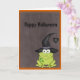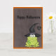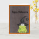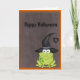 Grenouille adorable dans un casquette de sorcières avec un coeur noir suspendu. Halloween voeux sur un arrière - plan d'orange et gris