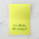 Grenouilles de dessin animé vertes heureuses avec des yeux bleus, des cœurs rouges et un fond jaune enjoué. Le texte à l'intérieur est un jeu de mots mignon qui dit "You Make Me Hoppy". Vous pouvez personnaliser le texte avec vos propres mots d'esprit et de sagesse si vous le souhaitez. Les grenouilles peuvent représenter l'amitié, l'affection, la romance, les rêves, la musique et le chant, la célébration, le bonheur, la chance et la bonne santé. Envoyez ou offrez ceci à des amis et à la famille, à un couple mignon, à des enfants, à un mari ou une femme, à un partenaire ; pour votre anniversaire, pour un anniversaire ou n'importe quel jour que vous voulez, et parfait pour les personnes qui sont optimistes, heureuses et qui aiment l'humour et les animaux de dessin animé faisant des jeux de mots drô