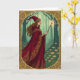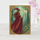 Une sorcière, habillée de rouge, portant une baguette magique, traverse un bois vert fleuri. Belle image non éffrayante pour Halloween.