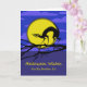 Halloween avant personnalisé pour frère, chat sur branche. Carte de voeux en papier avec un chat aux cheveux minces qui s'élance sur une branche avec une pleine lune jaune derrière elle. Des nuages remplissent le ciel nocturne sombre. Zone de couleur violette en bas avec texte jaune. Customisez le texte inférieur sur la couverture de cette carte pour un accueil personnalisé. Élément de chat grâce à l'entrée/l'ouverture. © Shoaff Ballanger Studios.