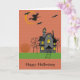 Carte d'Halloween orange pointillée avec une maison éffrayante, une sorcière, des chauves-souris, des fantômes et un grand citrouille défraîchi. Joli design pour les enfants. Merci à The Hungryjpeg et Creative Fabrica pour certains des éléments du design.