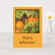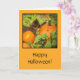 Carte Halloween avec un adorable chaton cueillant une citrouille dans un champ de citrouilles. Envoyez vos vœux de Halloween « paw-titivement » parfaits !
