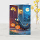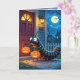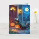 Un grand centipede de dessin animé tient des "jack-o"-lanternes debout devant une porte rouge la nuit dans un quartier de banlieue. Tout le texte peut être modifié.