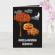 Famille Citrouille mignonne debout près d'un arbre à l'automne orange Feuilles sur un avec un ciel noir et une lune blanche et des nuages avec un message amical Halloween Hugs sur la couverture frontale et un endroit pour votre message personnel à l'intérieur.