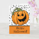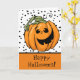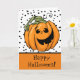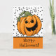 Une carte d'Halloween mignonne décorée d'une lanterne Jack 'O lumineuse joyeuse et de pois.