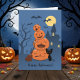 Un mignon chat noir et un balai de sorcière près d'une pile de citrouilles riants qui tombent. Un arbre mort, un manoir déplaisant, des chauves-souris et la lune sont vus sur l'arrière - plan.