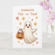 A cheerful little ghost floats happily with a pumpkin pail full of candy, surrounded by twinkling stars and playful hearts. This Halloween design is extra special with the option to add a personalized name on the front, making it a thoughtful choice for a daughter, niece, granddaughter, or any special girl you want to surprise. Inside, the sweet message brings smiles and giggles, celebrating the fun of the season with warmth and charm. A delightful keepsake for Halloween that feels both festive and personal.