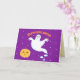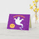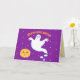 Carte de voeux Halloween avec un joli fantôme et citrouille sur arrière - plan royal violet. Les textes peuvent être personnalisés.