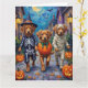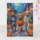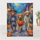 Adorable Nova Scotia Duck Tolling Retrievers habillés de costumes d'Halloween ludiques portent des seaux citrouilles tout en trompant ou en traitant sous le ciel illuminé par la lune. Ce design festif met en valeur l’aspect renard de la race, le manteau rouge-doré et l’esprit ludique, capturant parfaitement l’atmosphère éffrayante et amusante de la nuit d’Halloween. Une célébration joyeuse pour les amoureux de les chiens comme pour les fans d'Halloween.