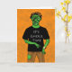 Carte de voeux pour Halloween avec un ghoul zombie pointant vers sa montre. Il porte un T-shirt noir avec les mots It's Ghoul Time. La peau verte et les pantalons déchirés ajoutent à l'image déplaisante. Copyright © Shoaff Ballanger Studios.