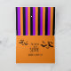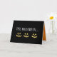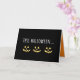 Le devant de cette carte d'Halloween amusante présente trois visages Jack-o-Lantern brillants et le texte qui dit : Cette Halloween.... Le texte à l'intérieur de la carte dit : Mange, bois et fais peur ! Joyeux Halloween ! Le dessus intérieur de la carte est orné d'un motif rayé coloré en noir, orange et violet. Le bas de la carte est orange et comporte des chauves-souris noires qui volent autour du texte.