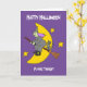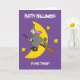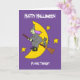Dessin d'une éffrayante vieille sorcière avec un nez méchant et des cheveux violets volant son broomstick au-delà de la lune accompagnée de son chat. Le message dit Happy Halloween et Flying Tonight et il y a une jolie araignée joyeuse à l'intérieur de la carte. Personnalisez facilement cette carte en éditant les zones de texte modèles - merci d'avoir vu mes cartes Halloween. N'aie pas peur maintenant.