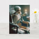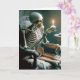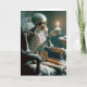 Un squelette est assis dans un fauteuil usé tenant un cupcake avec une bougie d'anniversaire éclairée. Tout le texte peut être modifié.