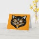 Cette image vintage a un visage de chat souriant fait dans les couleurs d'Halloween en noir, orange et blanc. Sa bouche est ouverte pour que vous puissiez voir ses crocs effrayants. Le fond est orange. Voir mon magasin Art by MAR pour apparier les produits avec ce design.