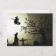 Sorcière d'Halloween volant sur un balai et un chien hurlant dans un cimetière avec croix et pierre tombale. www.giftideas505.com