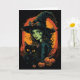 Carte d'Halloween Witchy - une belle sorcière à peau verte, portant son casquette noir avec un arc girly sur le devant. Elle est accompagnée de son fidèle familier - son chat noir qui vous regarde avec des yeux oranges captivants. Les citrouilles ont été taillés ; les yeux triangulaires, grinçant, sans dents et froids. Placez-vous sur un arrière - plan noir avec des cadres de couleur orange. A l'intérieur est le message - Avoir une Halloween éffrayante.