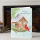 This hand-painted watercolor features a charming birdhouse adorned with a Happy Birthday banner, as a tufted titmouse and a cardinal stop by on a crisp winter day. Soft seasonal details and gentle colors create a warm, thoughtful scene, making it a lovely birthday piece for someone celebrating their 80th birthday!
