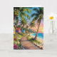A beautiful wedding anniversary card with a seaside tropical paradise illustration. Inside the card is a romantic poem. The front of the card is a beautiful illustration of a boardwalk along the coast, with palm trees with coconuts and strung fairy lights and small whimsical cottages.